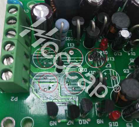 2. 高低电位间距较小的地方,电腐蚀强度更大,反应发生区域PCB走线腐蚀破坏或其他器件受影响失效,整版性能受损。【PCB损坏】