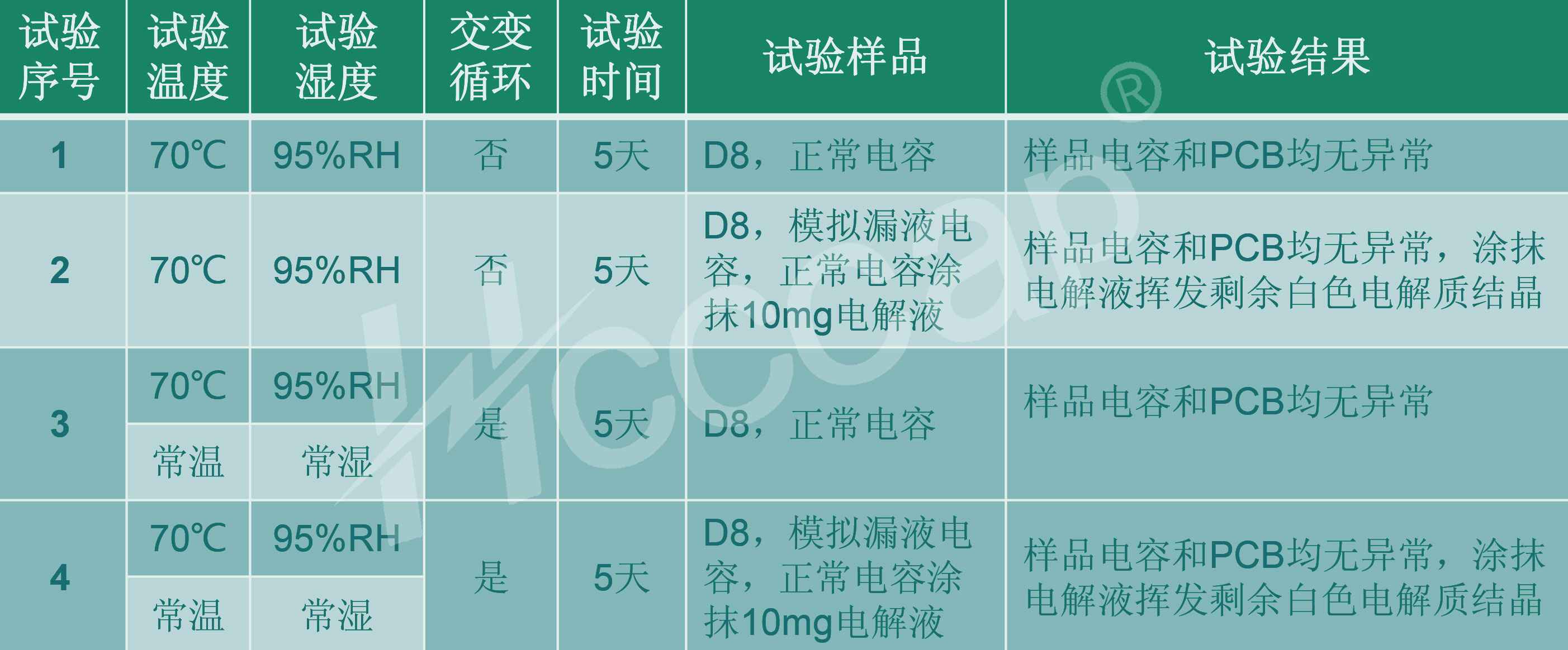 1.无论正常超级电容,还是模拟漏液电容,持续高温高湿(70℃ 95%RH)短时不会导致电容本身特性或者关联PCB出现异常;